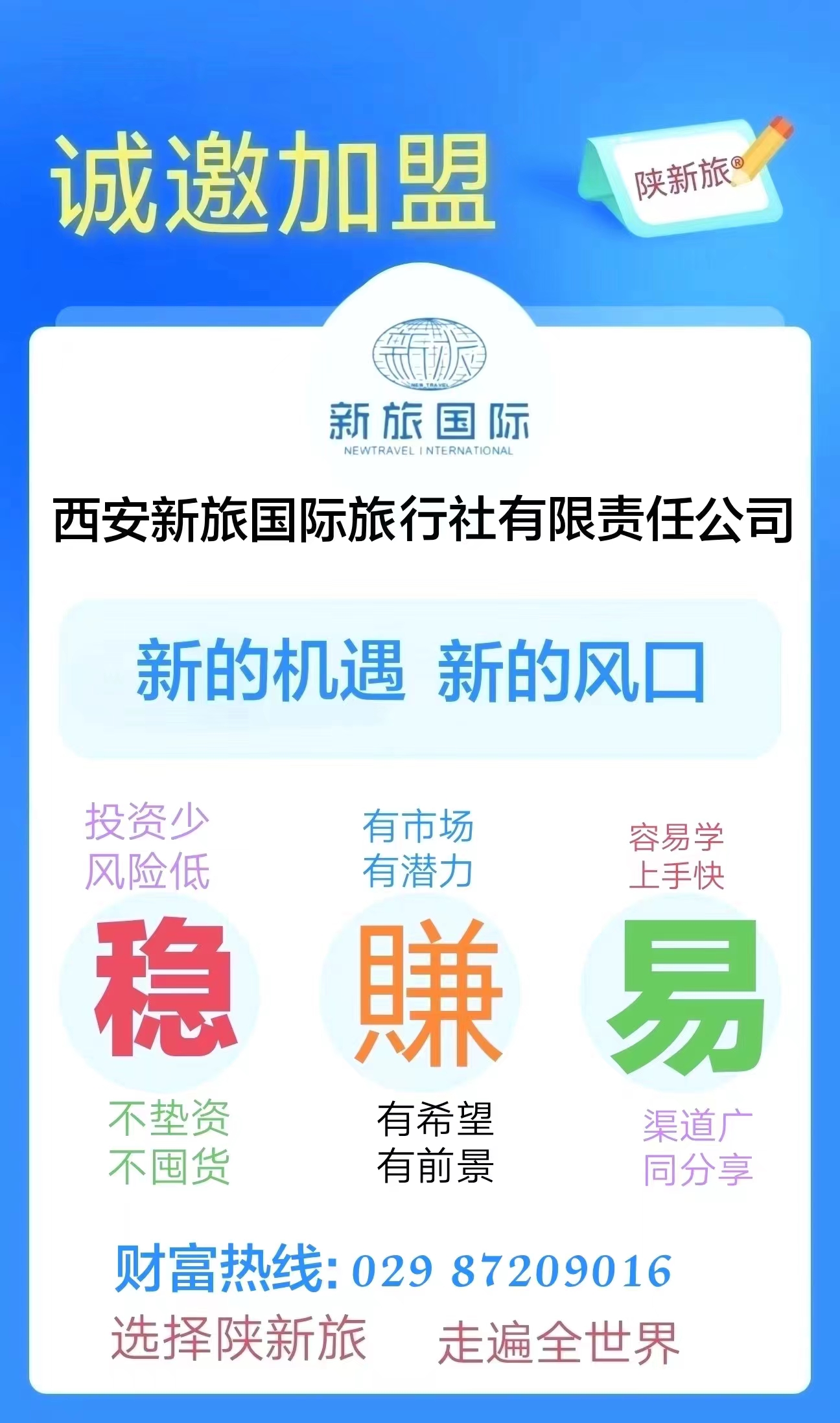 歡迎各地的有識(shí)之士能加盟到我們團(tuán)隊(duì)中來(lái),資源共享、共謀發(fā)展!為旅行創(chuàng)造精彩,讓游客感動(dòng)生活;選擇陜新旅,走遍全世界!
