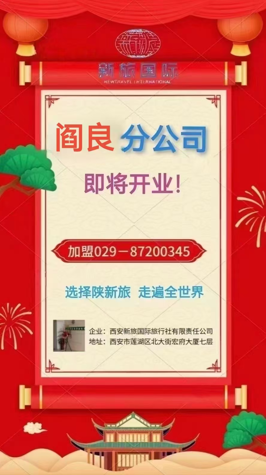 西安新旅國(guó)際旅行社有限責(zé)任公司閻良分公司 即將開業(yè)