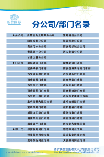歡迎各位有志于旅游業(yè)的人士加入西安新旅國際旅行社有限責(zé)任公司,攜手共進(jìn),共謀發(fā)展!