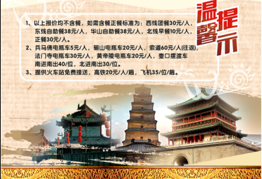我們堅持遵循:以質(zhì)量求生存、以創(chuàng)新求發(fā)展、以市場為導(dǎo)向、以服務(wù)為宗旨的經(jīng)營理念,為游客提供全方位、多元化、高層次的服務(wù)。 感謝各位對西安新旅國際旅行社的支持!